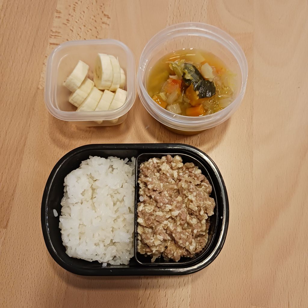 前日の夕飯の残りをいれました。甜麺醤が使えないので普通の大豆のみ使用した味噌で麻婆豆腐です。食い付き良いです。余裕があるときはフルーツも持っていって貰ってます。